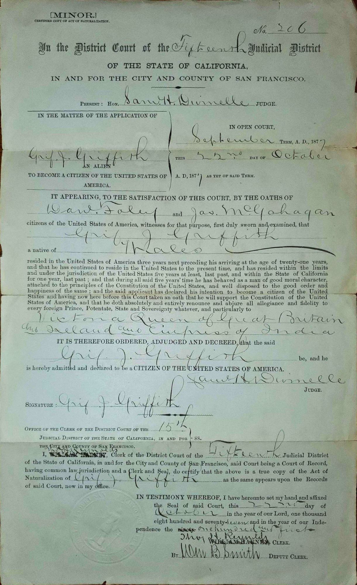 Grif’s American experience began when he seized the chance to leave his home in Wales, United Kingdom. By his own account it was 1866 and he was just 16. He had been born into a poor family and, in his autobiography, acknowledged that as a child he had had little love and less stability. Due to his mother’s ill health, he lived with his grandparents until they both died and then, around age 9, moved around between his father, an aunt and other relatives.