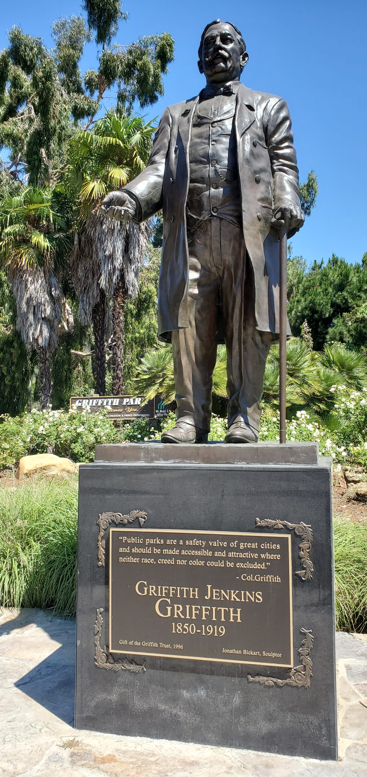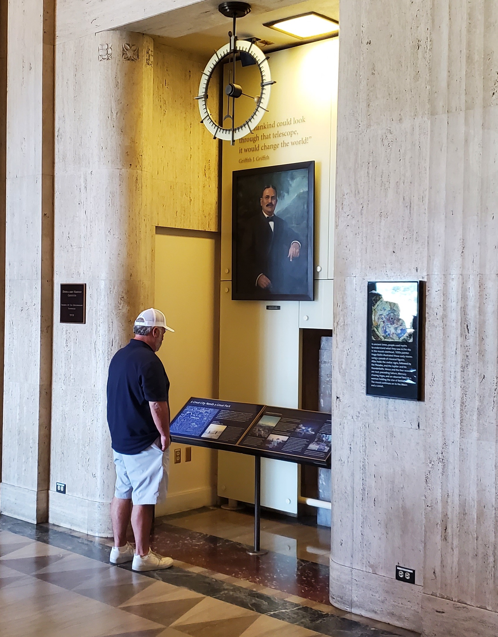 The most prominent tribute, at the Griffith Observatory, greets visitors inside the front entrance where it is hard to miss. A large portrait of Grif sits below his words: “If all mankind could look through that telescope, it would change the world!” A copy of the deed donating the park is to the right. Below that are two panels describing how Grif got wealthy via mining and real estate, and that “he decided”, “he wanted” and “he donated” the park. After noting Grif’s passion for astronomy, the panels celebrate “A Visionary Spirit” and an inspiring immigrant story: from Grif’s birth in Wales, to his leaving for America as a teen, to his making a fortune and then dedicating himself to improving Los Angeles and its crown jewel of a park.