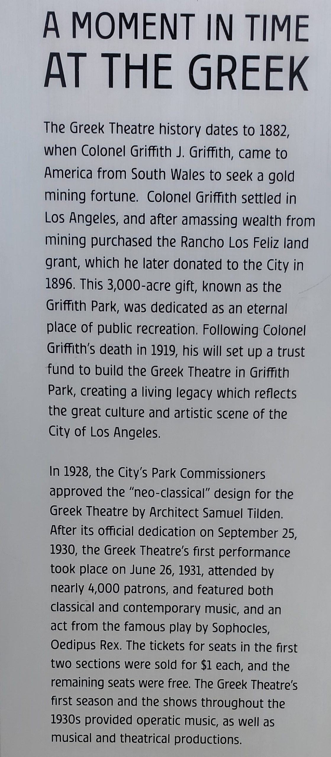 So how to correct the record? For one, please share what you’ve read here. I will work to also improve the wikipedia entries for Griffith Jenkins Griffith, Griffith Park, Griffith Observatory and the Greek Theater. But reading about Grif online or in a book is just part of what needs to happen. There’s an opportunity to share the fuller story of Griffith J. Griffith with the millions who visit Griffith Park annually and the 10 million Angelenos who live around it.