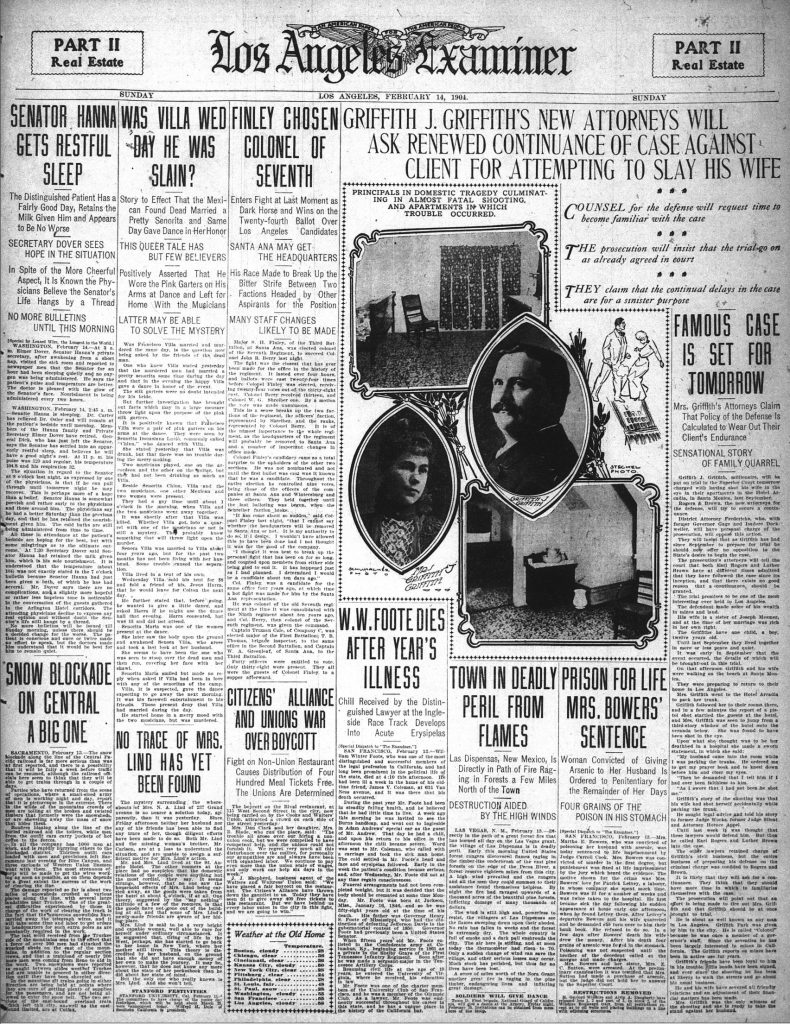 Newspaper readers were also being introduced to sensational stories, what would become known as yellow journalism, a style embraced by William Randolph Hearst as he expanded his publishing empire from San Francisco. His Los Angeles Examiner had entered the local market just six weeks before the trial started and seized on the Griffith drama as a way to stand out. From the start, the Examiner led the news pack with more coverage in terms of words, illustrations, large headlines and photos. Portrait photographs of Grif and Tina (see below) anchored its preview on the day before the trial (Valentine’s Day, no less), along with photos of the hotel suite where the shooting took place — and a sketch of a man holding a smoking gun as a woman falls back.