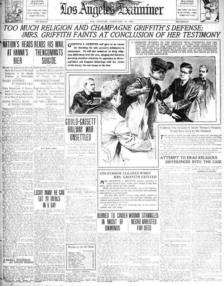 More testimony, and the verdict, will follow a bit later, but the “religion and champagne” headline calls for an immediate explanation. Earl Rogers felt that the only way to save Grif from prison was to destroy his good name — show him as an egotistical drunk who had temporarily lost sight of right from wrong. Temporary insanity would be the strategy built on Grif’s relationship with the Catholic Church and booze. Whiskey, champagne, martinis — anything with alcohol.