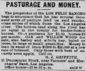The Times first referred to “Colonel Griffith” on August 13, 1885, when it directed readers to select ads in that day’s edition.[1] Taken out by Grif, the ad (see below) was short, to the point and came across as if Grif had tired of running the rancho or, worse, was not able to make it work financially. “The proprietor of the LOS FELIZ RANCHO,” the ad began, “begs to announce that he has several thousand acres” to pasture cattle at $1.50 a head per month and horses at $2. Oak and willow wood were also for sale, as well as hay. The last sentence presented his newest business venture: “Money to loan in sums from $1,000 to $50,000”. Interested parties were to visit Grif at his new downtown office on Main Street.