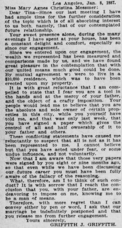 So began a marriage hailed by local papers but which, behind closed doors, was fraught with tension over religion and money. Fortune hunter, or not, Grif would soon use his wife’s inheritance to create a real estate conglomerate. A quick sale of much of the Briswalter tract would net nearly $1 million (about $34 million today) and set up the financial conditions for Grif to seriously consider donating most of his beloved Rancho Los Feliz.[12]