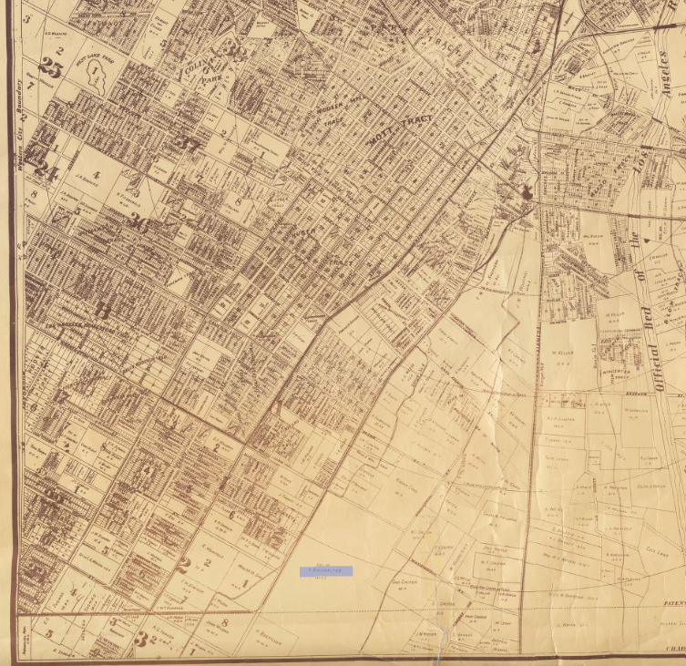 The Briswalter tract is highlighted at bottom in 1887, when it was one of the largest undeveloped parcels closest to downtown, located at top right. The city was expanding south, making the tract even more valuable. Tap the image to explore the map via the Los Angeles Public Library.