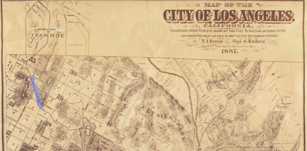 The Los Angeles and Ostrich Farm Railway, highlighted at left, made its way to the rancho by passing through the Ivanhoe area, which Grif and other property owners were trying to subdivide. Tap the image to explore the map via the Los Angeles Public Library.