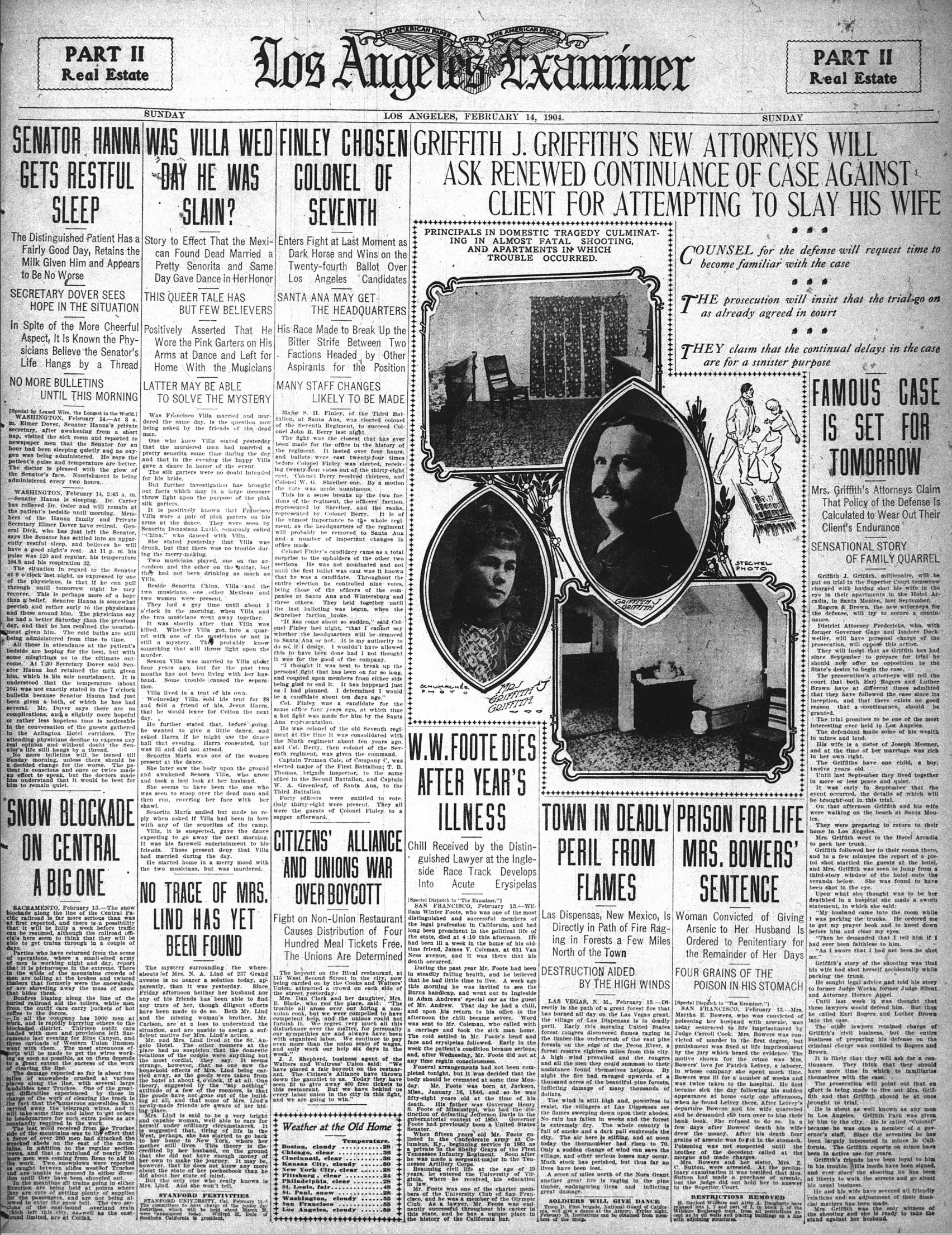 The Times was now starting to join the media circus with its own choice, colorful words splashed in big type: “Mrs. Griffith Smites Again” was the Times headline. “She was egged on to file this amended complaint by Col. Griffith’s sworn answer, in which he made the assertion that he had always been ‘a kind and loving husband’,” the report stated. “She swears that in yesterday’s amended answer that he manifested his loving consideration by trying to murder her with a loaded revolver three months before the Santa Monica tragedy, also by making a brutal assault upon her (in 1900) and cheating her out of her property.”
