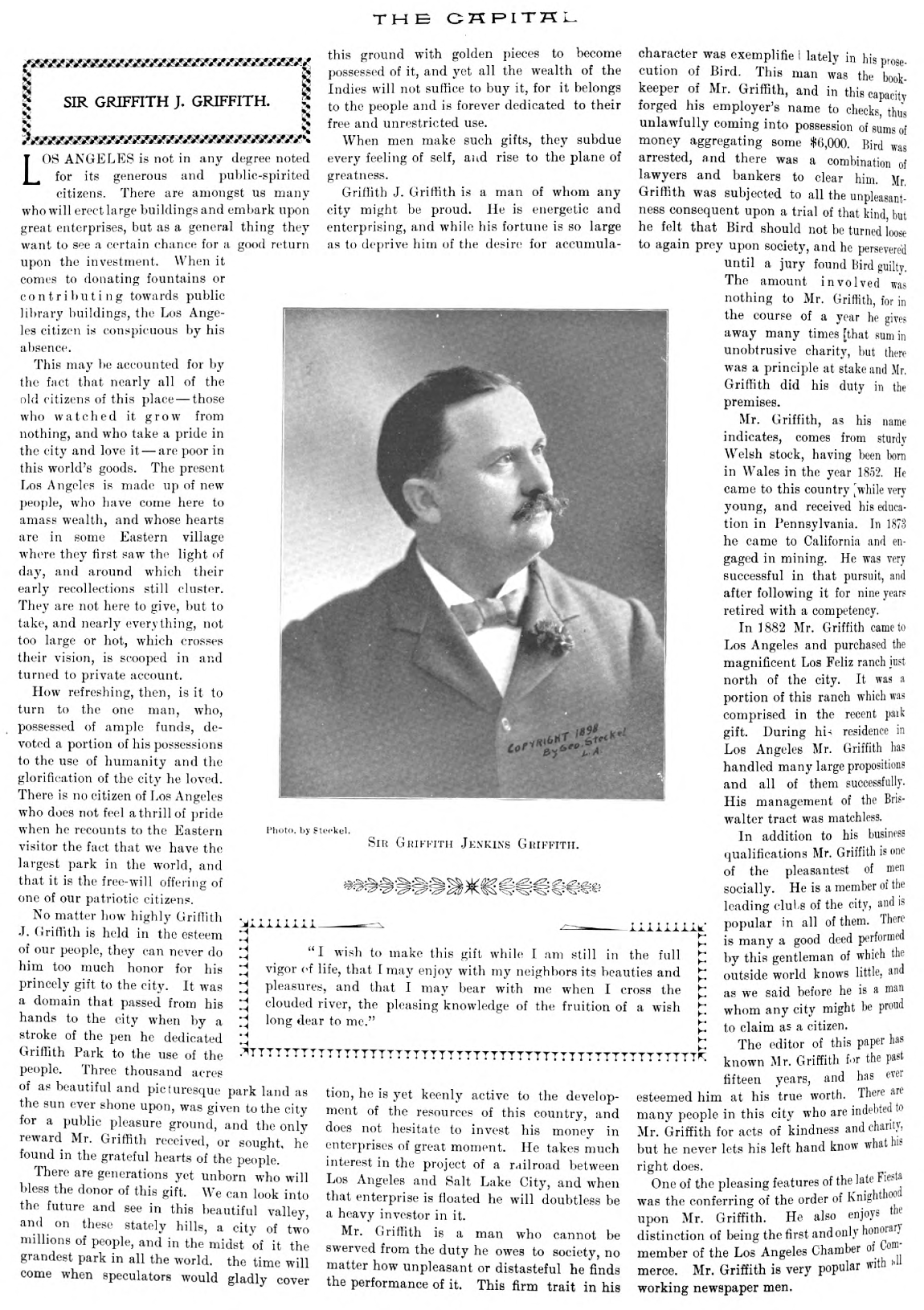 Six months later, on July 5, he was back for the Times’ “Patriotic War” edition, where a new profile and pen portrait focused on “the princely generosity of a public-spirited citizen who asked only that his munificent gift should be made easily accessible to the humblest citizen, and suitably improved for the benefit of all.” The Times was celebrating  U.S. military might in the midst of the war against Spain in Cuba,  and used the various profiles to showcase patriotic Americans, honoring the Wales-born Grif as one of its own. “Griffith, though not born in America,” it stated, “he nevertheless is thoroughly imbued with the liberal spirit which makes up the ideal American citizen.”