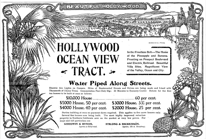 Mind you, turn-of-the-century Hollywood was not much of a town. It wasn’t even Hollywood, technically, but Nopalera. Hollywood was the name of the tract platted by Harvey Wilcox. In 1900, the entire area had around 500 residents, thousands of acres in barley and wheat, and hundreds of thousands of lemons harvested annually, especially for the market against scurvy. Those lemons thrived in a frostless belt along the Cahuenga Valley and in Hollywood proper. Pineapples and bananas were also grown there — creating a unique marketing angle when pitching land to Easterners tired of cold weather.