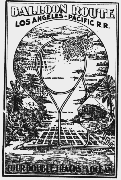By early 1900, the rights of way were secured. For a mere $5, Grif himself sold the Los Angeles-Pacific Railroad a 35-foot-wide strip of land connecting Hollywood to the existing rail line at the city limit of Los Angeles.[14] The line continued expanding west to Santa Monica and its beautiful beaches. By 1901, the line had a Balloon Route that was a tourist sensation, advertising “10 beaches and 8 cities … 101 miles for 100 cents in 1 day.”[15]