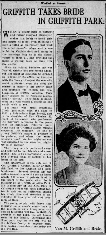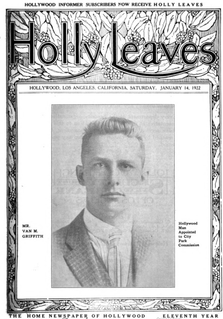 That loyalty, perhaps even devotion, was shaped at a very young age. Van was eight years old when his parents donated Griffith Park. But it was Grif, not Tina, who became the toast of the town. Remember it was Grif who was made a lifetime member of the Chamber of Commerce. Grif who was “knighted” at the 1897 Fiesta. Grif whose name constantly appeared in newspapers. Grif as a celebrity must have left an impression on Van that his dad was something special. Someone he could look up to, whereas mother was relegated to taking care of the family.